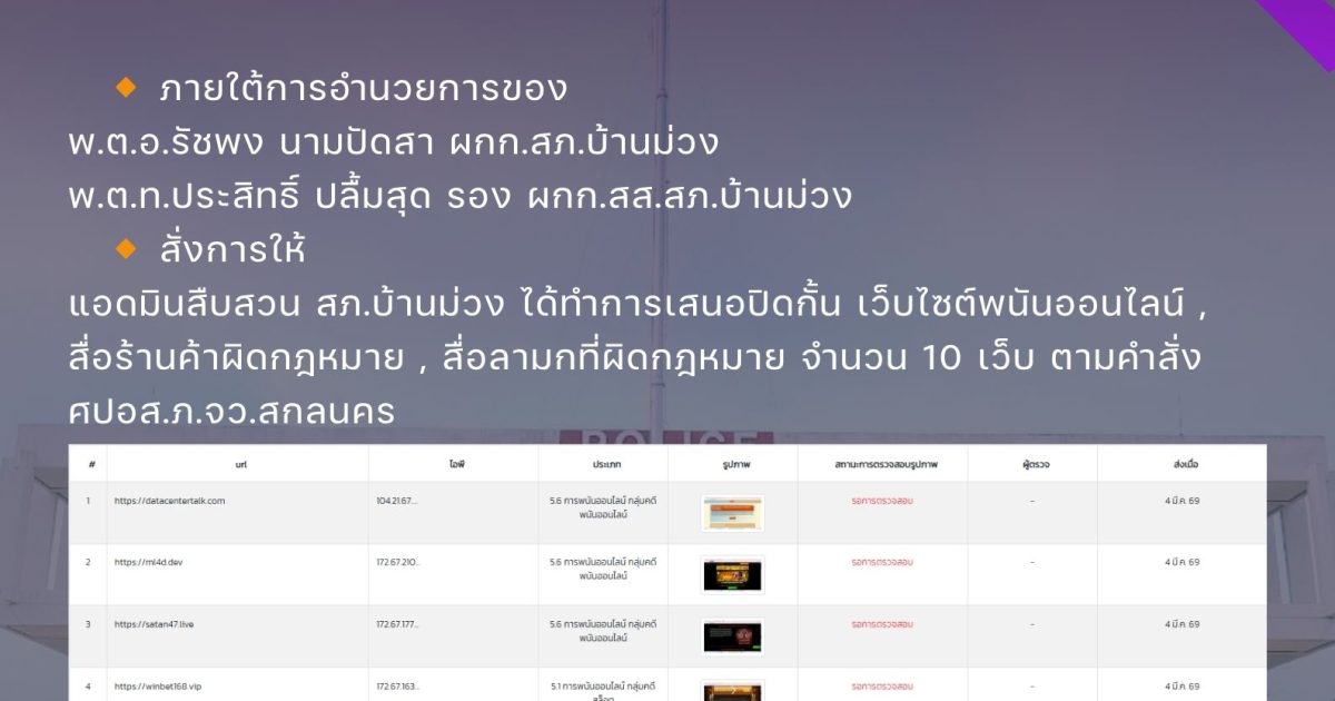 รายงานผลการปฏิบัติ สถานีตำรวจภูธรบ้านม่วง การเสนอปิดกั้นเว็บไซต์พนันออนไลน์