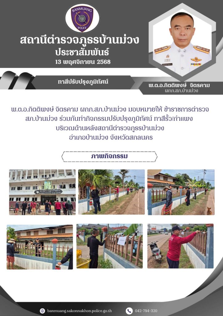 ร่วมกิจกรรมปรับปรุงภูมิทัศน์ ทาสีรั้ว กำแพง บริเวรด้านหลังสถานีตำรวจภูธรบ้านม่วง