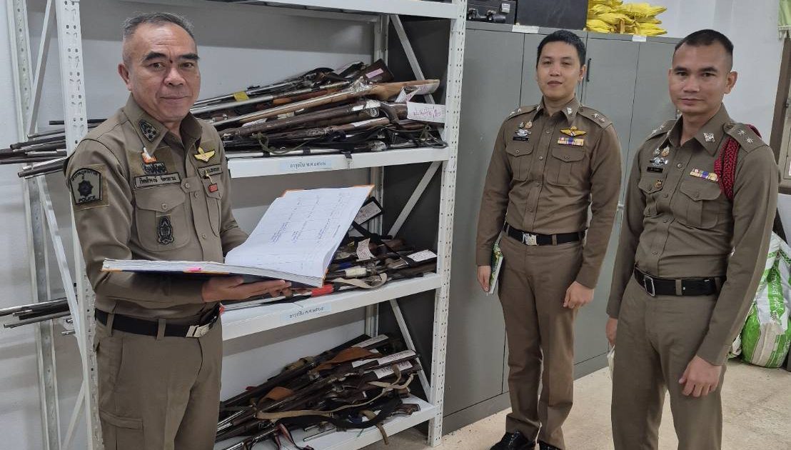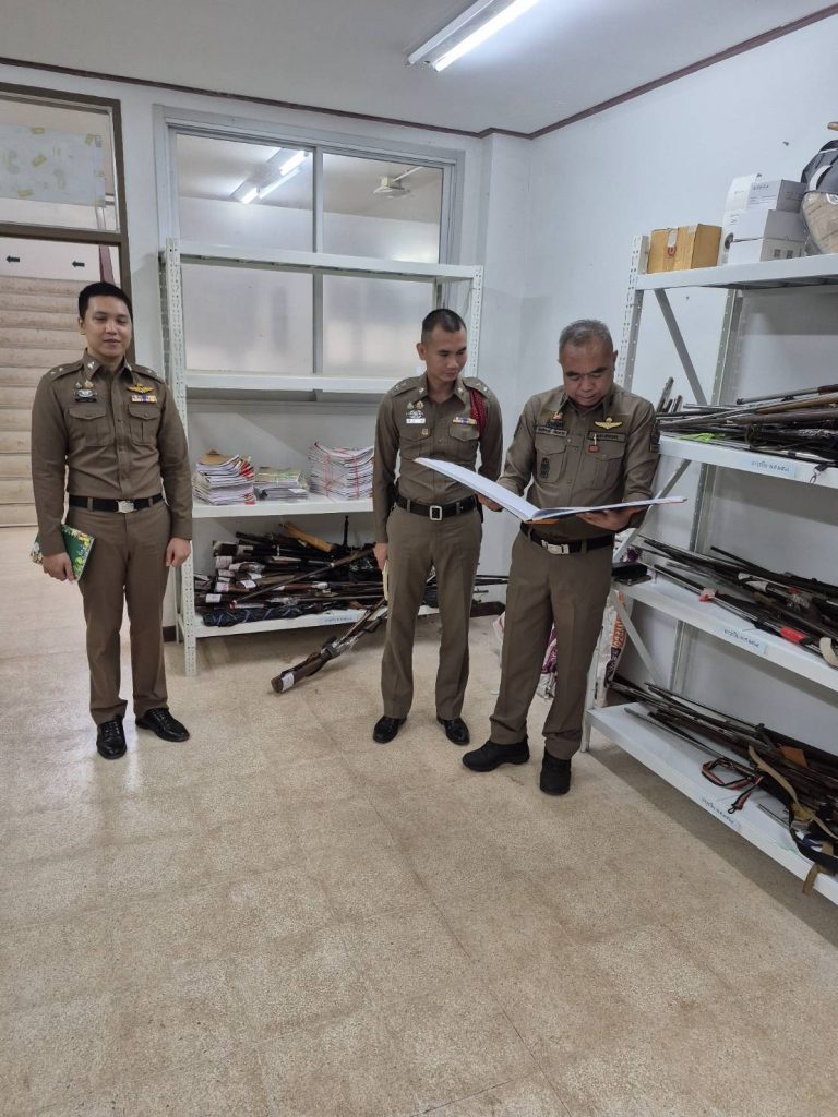 พ.ต.อ.กิตติพงษ์ จิตรคาม ผู้กำกับการสถานีตำรวจภูธรบ้านม่วง พร้อมด้วนเจ้าหน้าที่งานสอบสวน พนักงานสอบ ตรวจสอบความเรียบร้อย ความสะอาดของห้องเก็บของกลาง