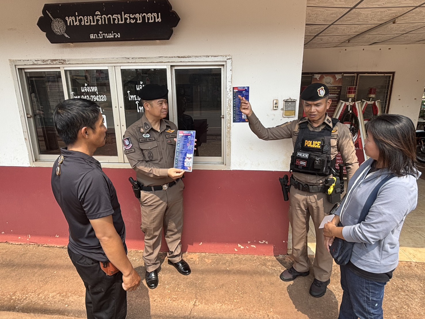 พ.ต.ท.สรรพสิทธิ์ เกื้อทาน สวป.สภ.บ้านม่วง พร้อม ชุดสายตรวจออกประชาสัมพันธ์ ติดสติ้กเกอร์